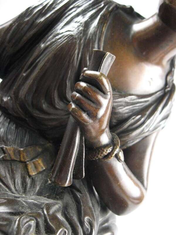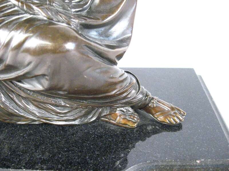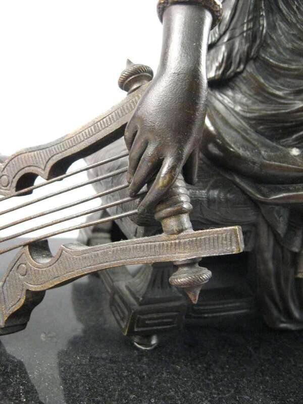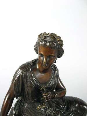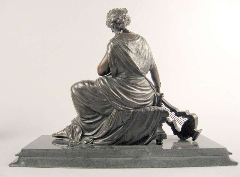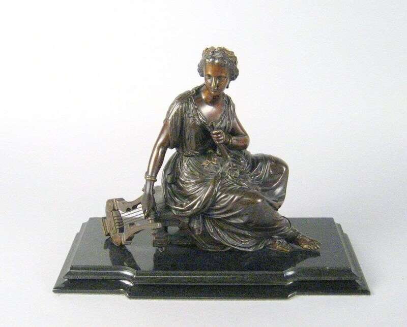 Dark brown patina, modeled as a draped female wearing a laurel wreath and seated on a bench, she holds a scroll in one hand and a lyre in the other, mounted on a shaped rectangular black marble base.