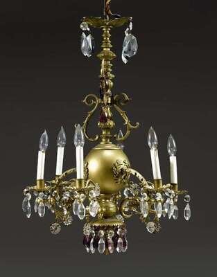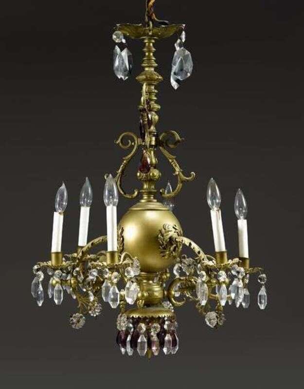 The central shaft with an orb issuing six foliate cast candle arms hung with purple and clear glass prisms.