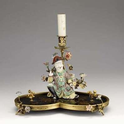 With a modeled porcelain figure of a seated Oriental man above a heart-shaped chinoiserie decorated lacquer base and surmounted by a gilt bronze foliate cast candlestick issuing gilt foliage and porcelain flowerheads.