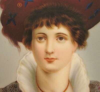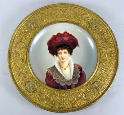 Painted with a portrait of a young woman in 17th century dress, in a molded circular baroque style metal, unmarked.