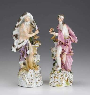 'Winter' modeled as a bearded man wearing a purple cloak painted with floral sprigs, beside a brazier; 'Spring' modeled a young woman attired in loose pink robes painted with floral sprigs, beside a pedestal topped with flowers; each on a rococo scroll base, blue swords marks to undersides. (2).