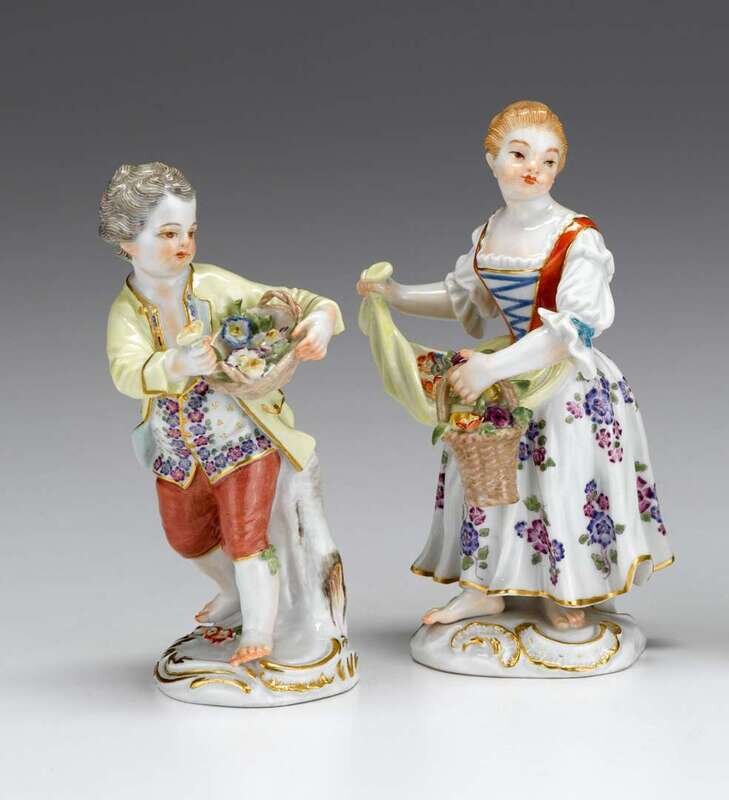 Each modeled standing in 18th century attire and holding baskets of flowers, blue crossed swords and incised marks to undersides. (2).