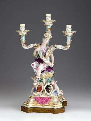 Modeled as a classical female supporting three foliate candlearms seated on a plinth applied with the Polish/ Lithuanian Commonwealth and Saxony coats of arms and flanked by putti, blue underglaze crossed swords mark.