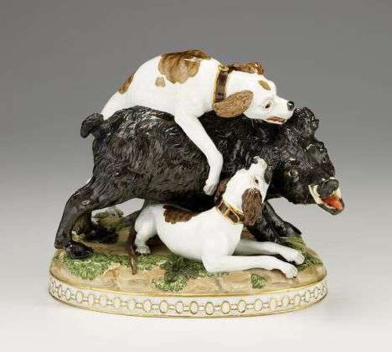 Modeled as two dogs attacking a wild boar, raised on an oval base; underglaze blue crossed swords marks to underside.
