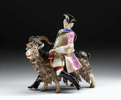 After a model by J.J.Kandler, modeled as the tailor astride a billy goat, wearing pink floral coat, tricorn hat, the tools of his trade applied around him, blue cross sword marks.