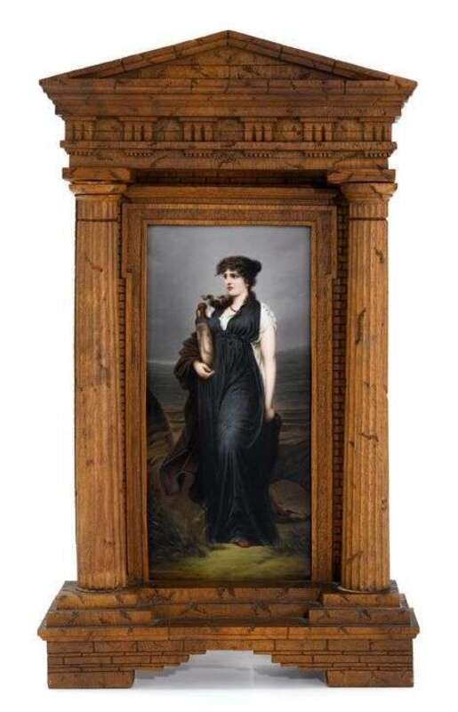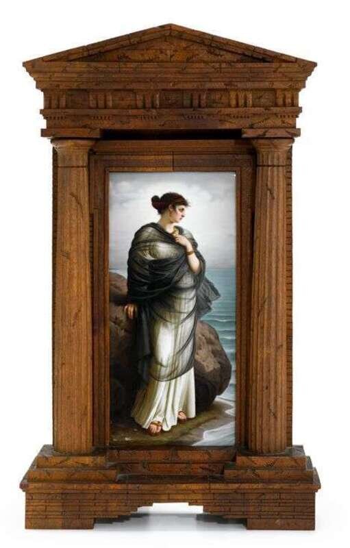 Each depicting a classical woman, dressed in flowing robes, standing beside the ocean; one woman holds an amphora; both are framed in carved 'temple' frames with arched pediment and freestanding columns; plaques with incised marks. (2).