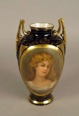 Of swollen cylindrical form with two squared gilt handles to the sides, the body painted with an oval portrait of a young woman and decorated with painted gilt details, on a circular foot, the underside with the blue 'beehive' mark and stamped 'Royal Vienna'.
