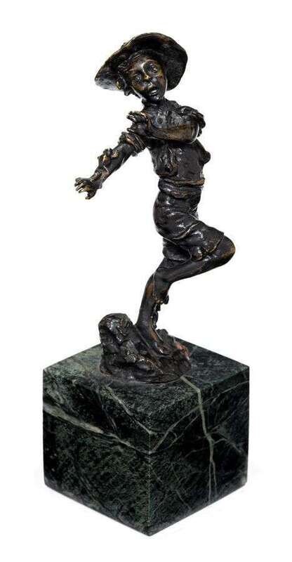 Bronze dark brown patina, modeled as a boy surprised by a frog on his arm, signed C. Kauba and 'Geschutz', mounted on a square green marble base.