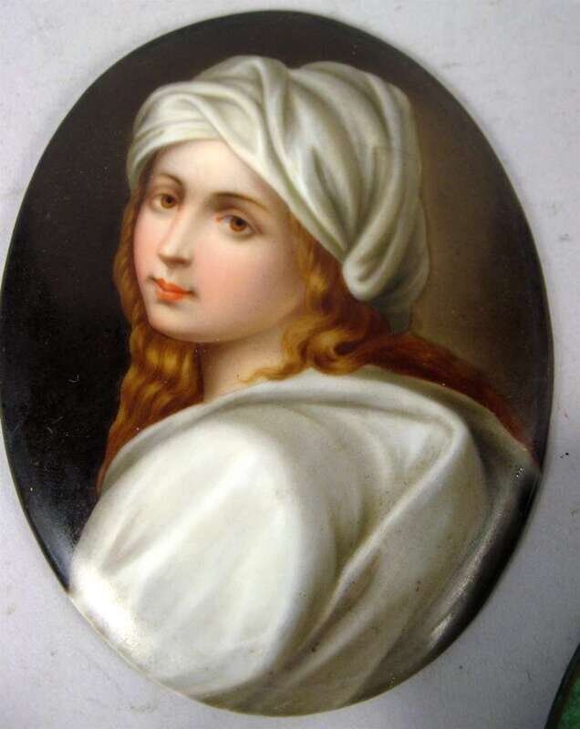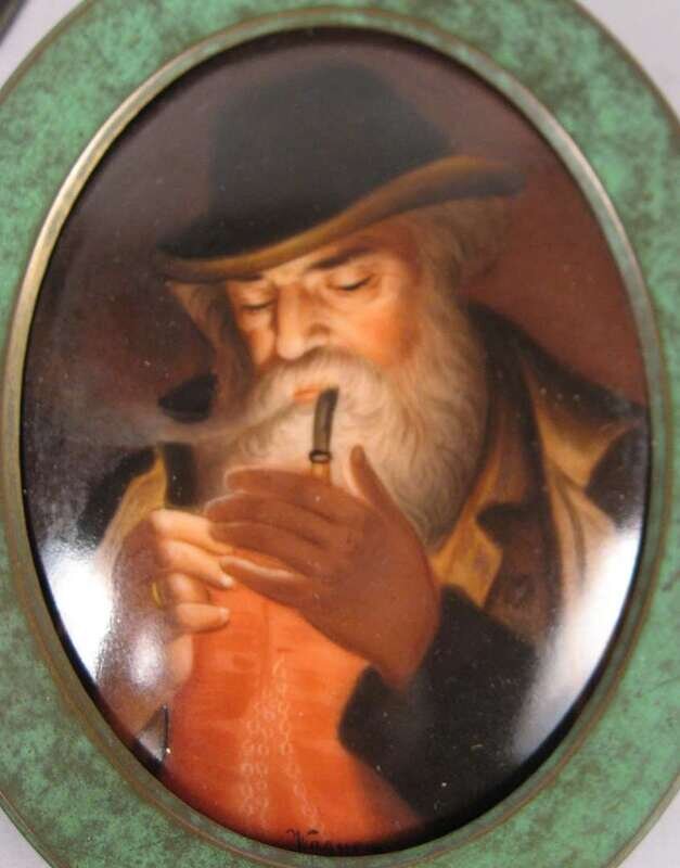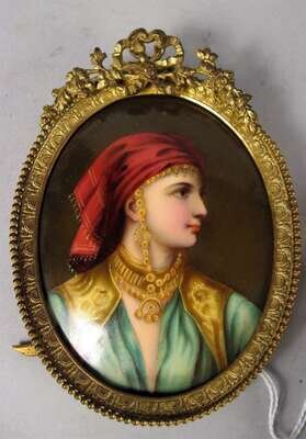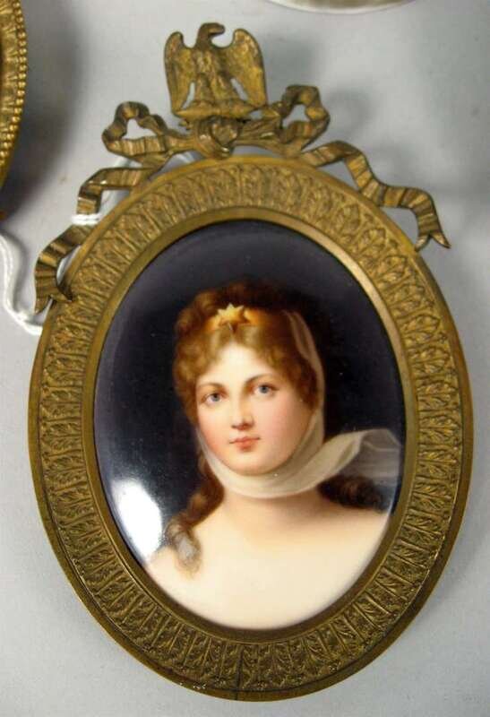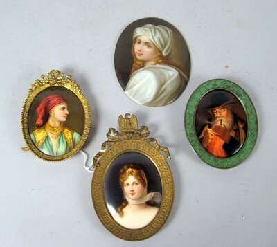 All oval, one depicting an oriental beauty; one with a portrait of Queen Louise; one with a bearded man lighting his pipe, signed Wagner and the last depicting young beauty with a white headdress, two in gilt metal frames, one a green-patina frame and one unframed. (4).