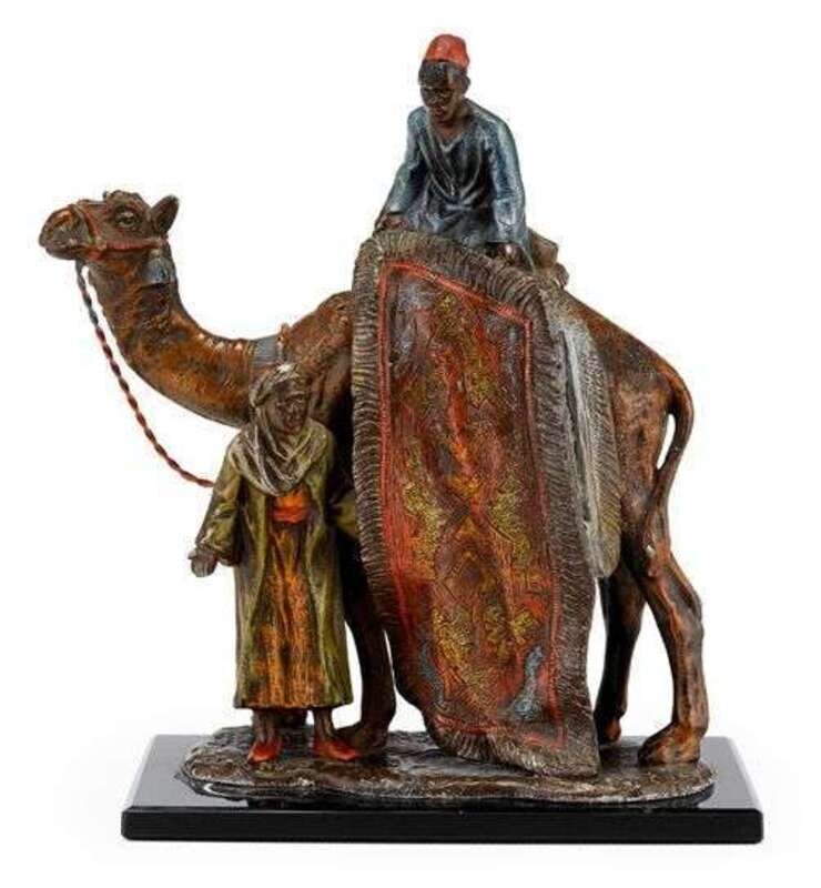 Modeled as an carpet seller seated on a camel, unmarked; formerly a table lighter, the mechanism now lacking.