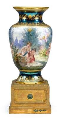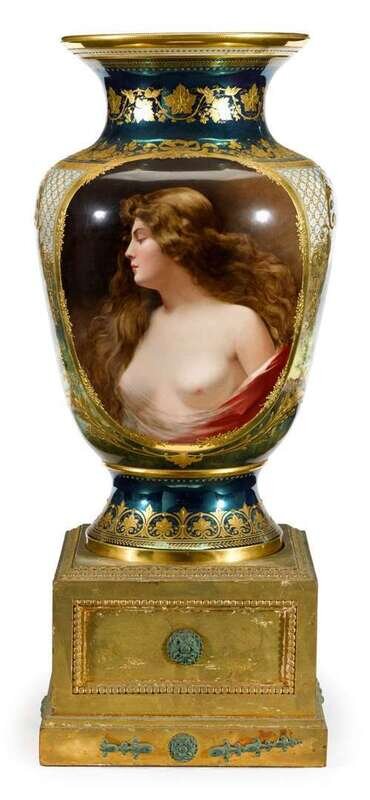 The baluster form body painted with an oval semi-nude portrait of Erbluth, after Asti, the reverse with a continuous scene of cupids at play in a wooded landscape, signed Otto Zwierzina, against a blue green iridescent ground with foliate gilt bands and gilt beads, gilt floral decorator's overmark and blue beehive mark with red serial nos., raised on a carved giltwood plinth base.