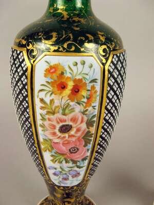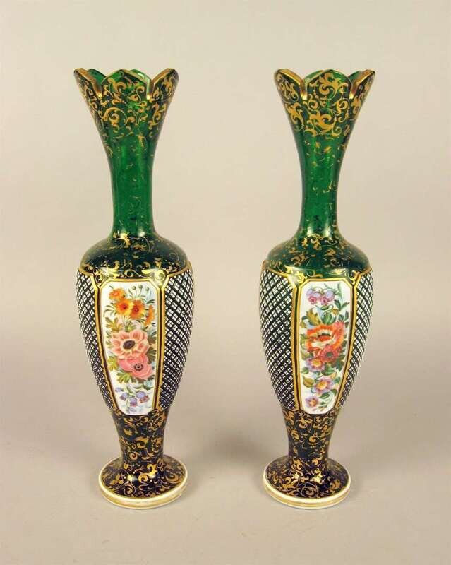 Pair of French enameled and gilded green glass vases late 19th century