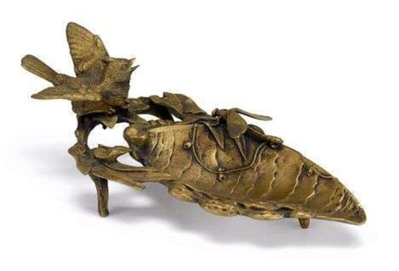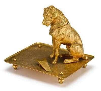 Comprising an inkwell cast as a seated dog on square tray; and a leaf form vide poche surmounted by dragonfly and birds after Jules Moigniez. (2).