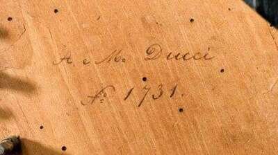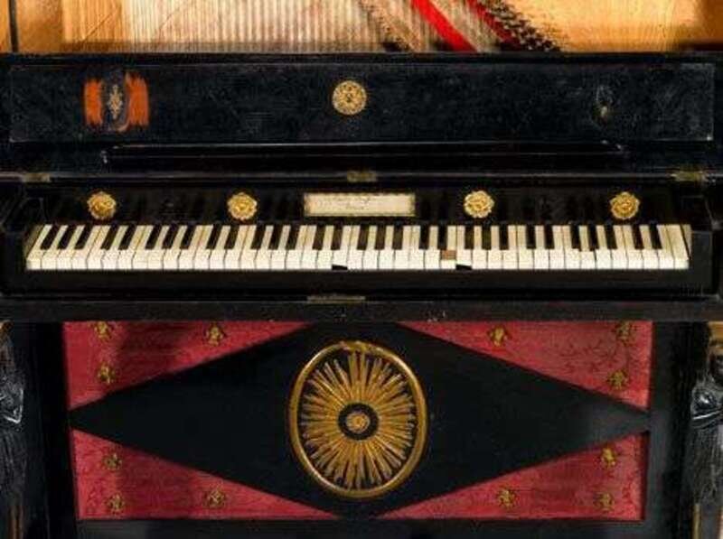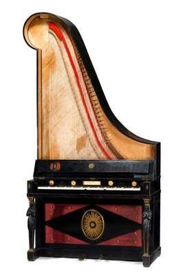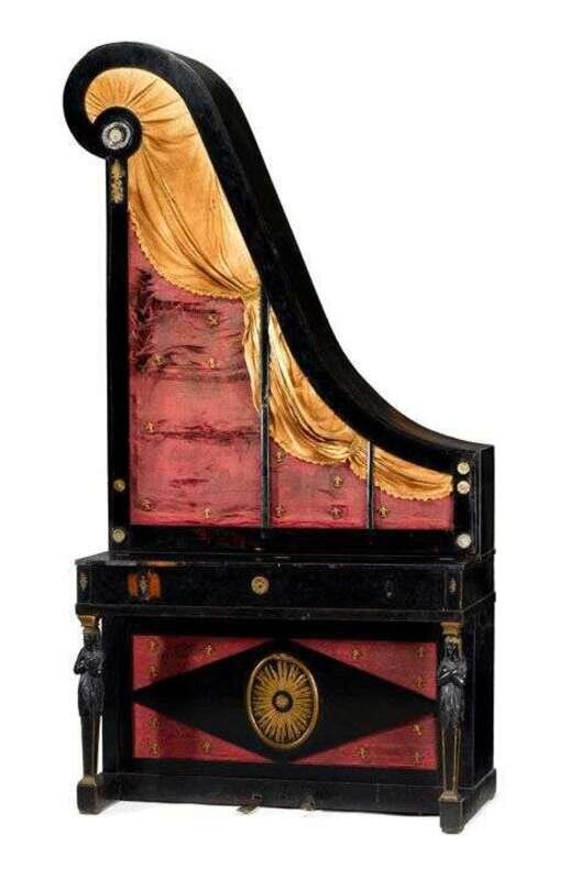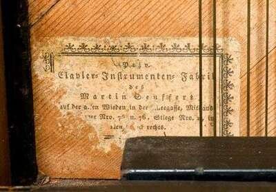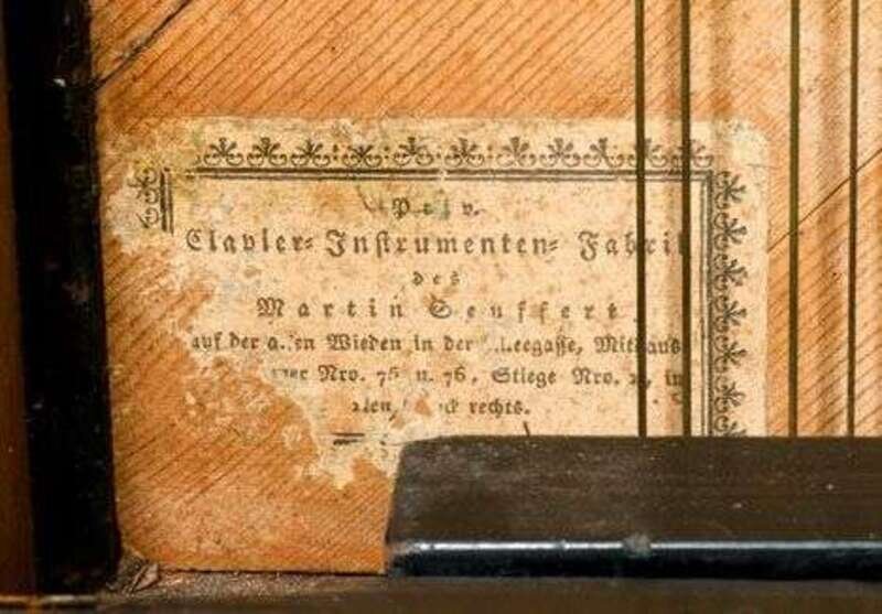 The ebonized vertical soundboard with a scrolled top, the conforming cover panel lined with red pattern silk and gold silk swags and applied gilt metal mounts, the covered six keyboard back panel bearing inscribed label 'Martin Seuffert/ Wienn'; the keyboard supported on Egyptian terms, the footboard cover also silk lined with an ebonized lozenge panel applied with gilt metal sunburst and fleur di lys; the soundboard bearing label 'Priv./ Clavier=Instrumenten=Fabrik/ des/ Martin Seuffert/ ...auf der alten Wieden in der (Al)leegasse, Mithaus =/ Nro. 75 u. 76, Stiege Nro. 3 um/ (er)sten (sto)ck rechts'; also with ink inscription to interior 'A.& M. Ducci/ No. 1731'; six octaves, FF-f4. NOTE: Martin Seuffert (1772-1847) was the son and grandson of organ builders. In 1802 he was one of the founders of 'Wachtl & Co.' which developed the upright grand piano which due to it's unique form was given the name 'Giraffe piano'. In 1827 he went into business with John Seidler and traded under the name 'Seuffert & Seidler', eventually adding his son Eduard, also a piano maker, to the firm.