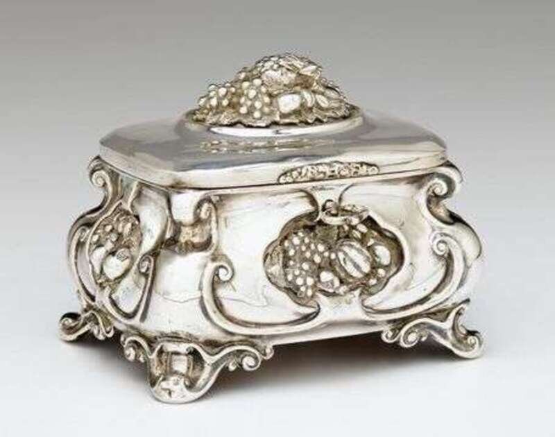 The bombe sides centered by oval reserves mounted with cast fruit groups, the hinged lid surmounted by a large fruit grouping, opening to a gilt interior, raised on scroll feet, stamped 84 standard and city mark.