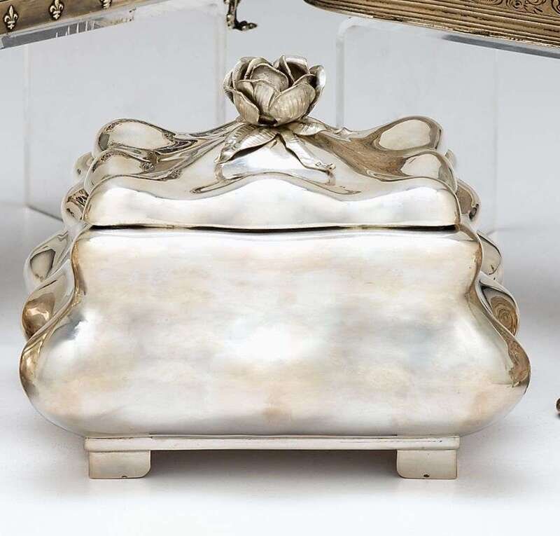 Of organic shaped casket form with an hinged lid and a rose finial.