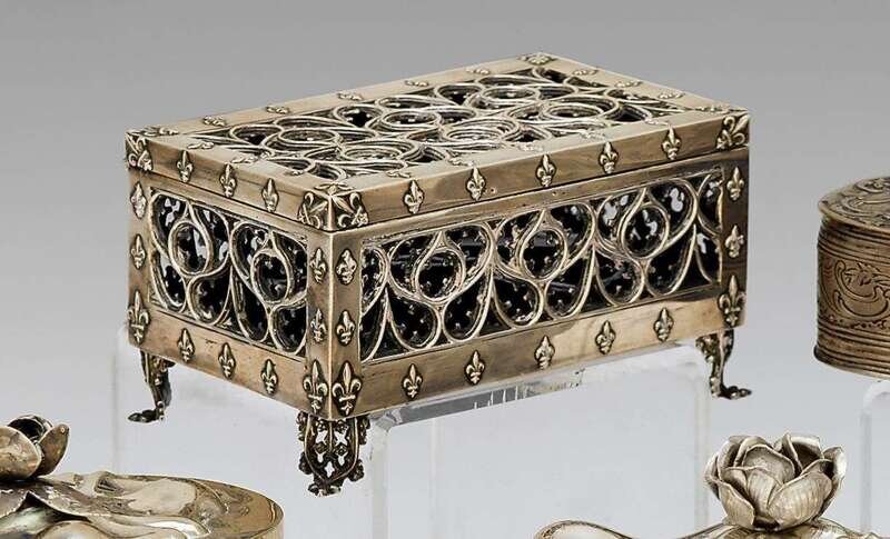 Of casket form, the hinged top and side with pierced Gothic decoration, raised on pierced stylized leaf feet.