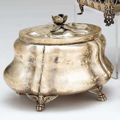 Of organic oval form, the hinged lid with a rose finial, raised on winged hairy paw feet.