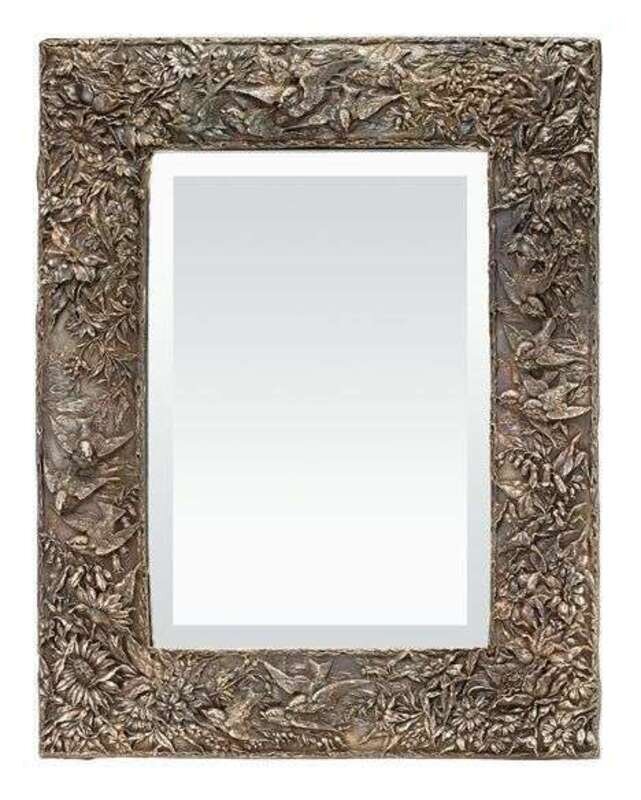 The rectangular mirrorplate surrounded by a repousse foliate and fauna decorated frame, stamped 'JR' and '925'.