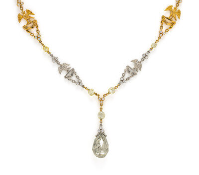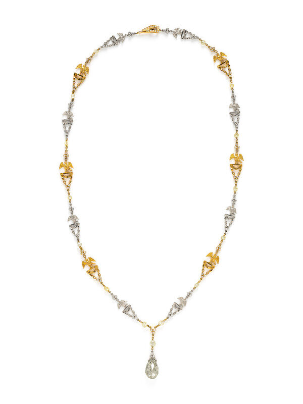 Consisting of stations depicting an eagle crest with the motto 'virtute tutus' flanked by round brilliant cut diamond clusters weighing approximately 2.00 carats total, faceted diamond beads and one briolette weighing approximately 13.00-15.00 carats. Mounted in 18 karat yellow gold and platinum. 23 1/3 inches long.
