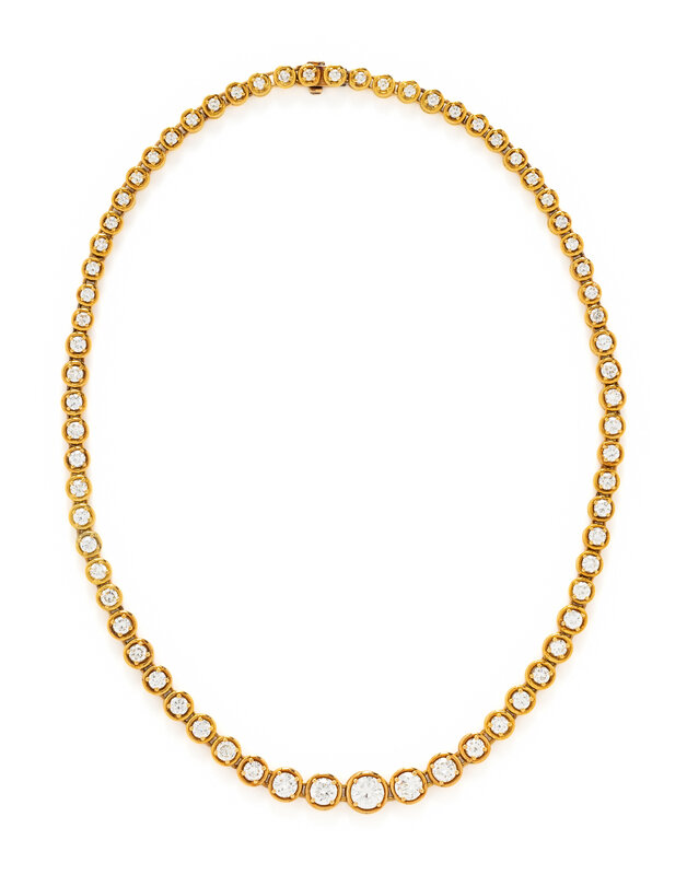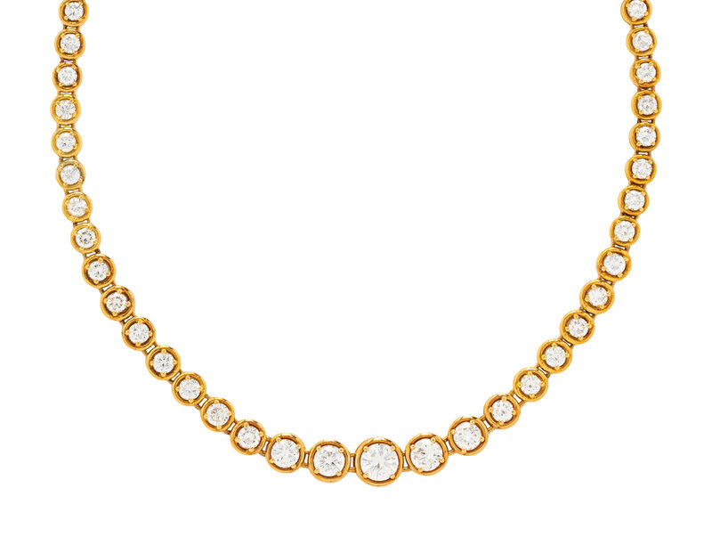 Containing round brilliant cut diamonds weighing approximately 10.00-12.00 carats total. Mounted in yellow gold. 16 inches long.