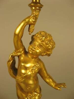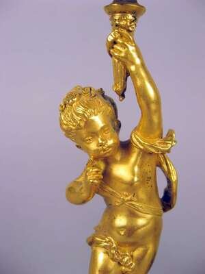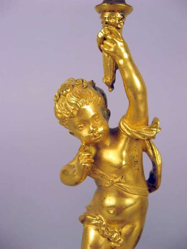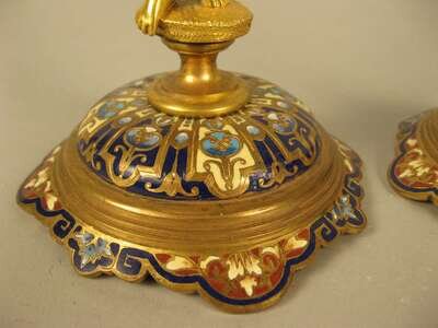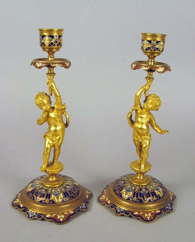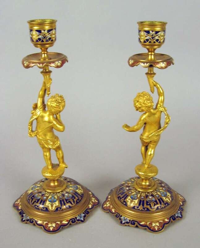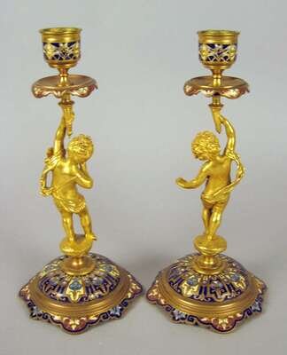 Pair of French figural gilt bronze and champleve candlesticks