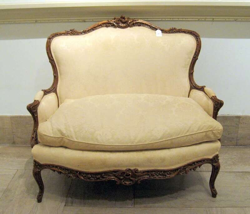 The molded double arched floral carved crestrail above a padded and loose cushion back and loose cushion seat flanked by part padded closed arms, raised on short cabriole feet with scrolled toes.