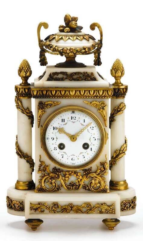 The clock with a white circular painted enamel dial set in an upright rectangular white marble case flanked by columns and surmounted by a flower filled urn, on a shaped base and toupie feet, with a pair of matching candelabra; together with a similar white marble inkwell. (4).