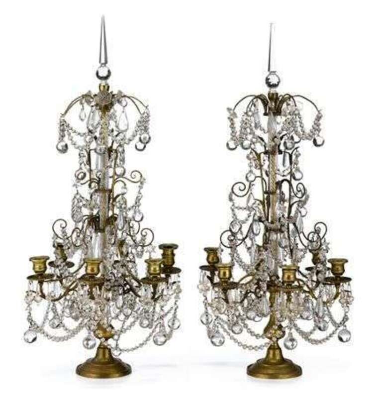 Each with a glass enclosed standard with a spire finial and issuing six scrolling candlearms and prism arms hung with glass bead swags, raised on a shaped circular foot. (2).