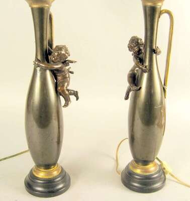 The slender baluster form with pinched mouths and mounted with putti; mounted as lamps. (2).