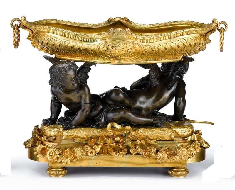 The shaped gilt bronze oval basket with ring handles supported by patinated putti on an oval base hung with ribbon tied floral garlands, raised reeded bun feet.