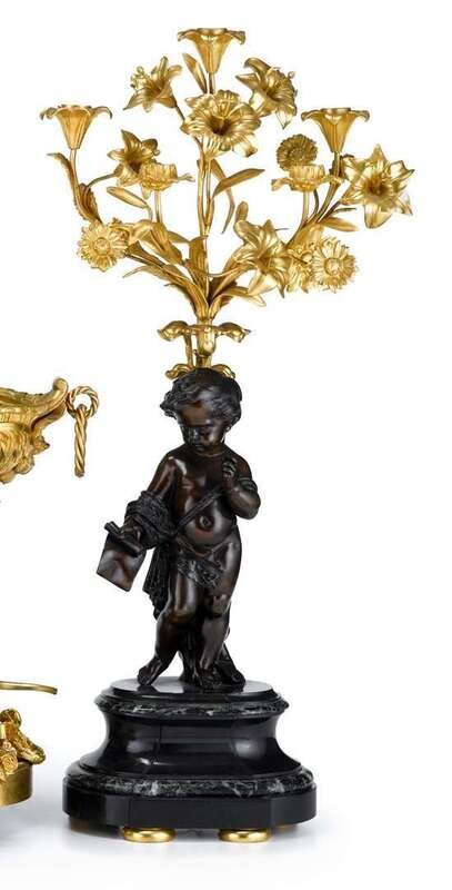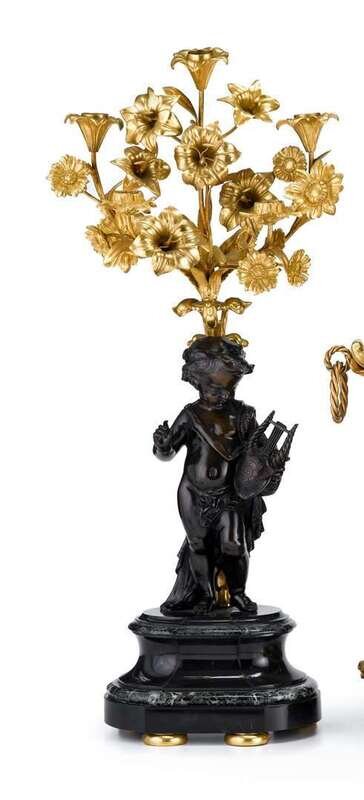 Each with a putto and a standard issuing five foliate candlearms and blossoms, raised on a stepped oval marble base. (2).