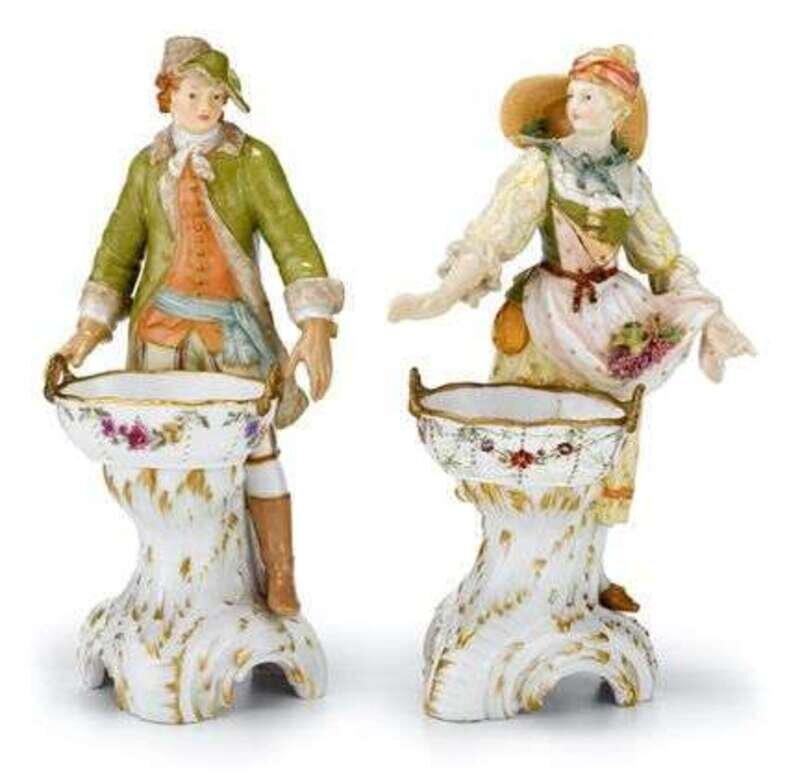 Modeled as a farmer and companion, each figure standing beside a flower painted basket, blue scepter and red printed orb mark. (2).