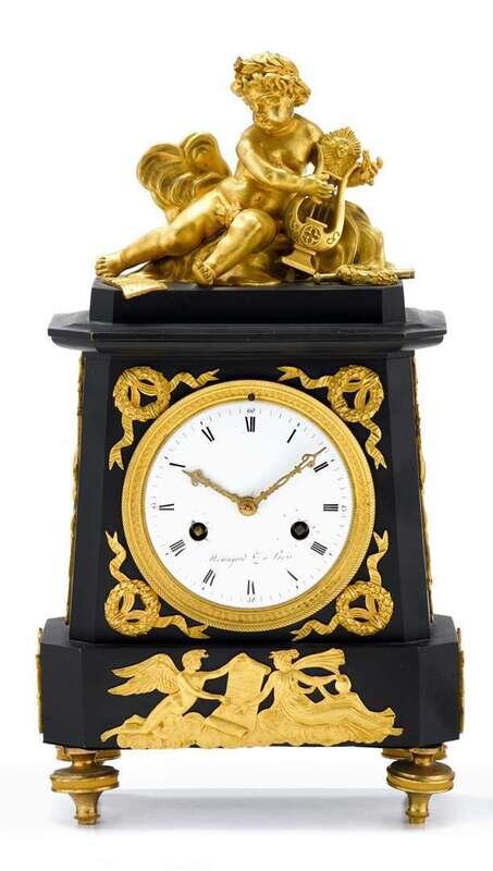 The tapered square black patinated case surmounted by a gilt bronze musical putto, and fitted with a white enameled Roman numeral dial with gilt wreath corner mounts, over a classical mounted frieze, raised on toupie feet.