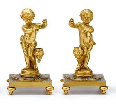 Each with a standing figure of a putto, on a square champleve base raised on toupie feet. (2).