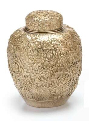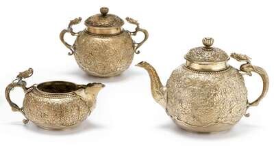 Comprising a teapot, sugar bowl, creamer and tea caddy, the globular bodies with repousse chrysanthemums and dragon handles, Chinese three character marks. (3).