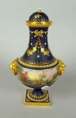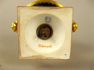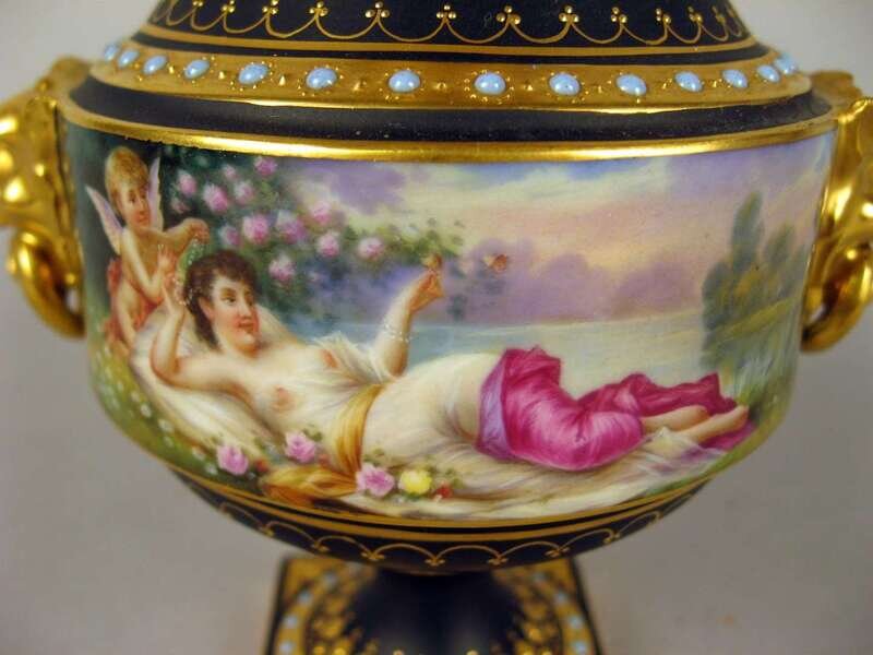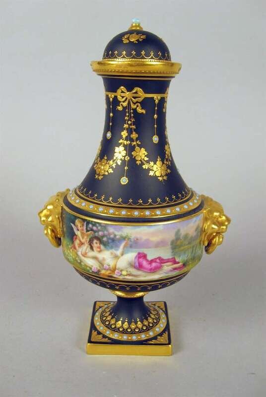 The first example with turquoise 'beads', gilt details, and molded lions' mask handles, painted with a continuous band depicting a reclining maiden and Cupid on a black ground, inscribed 'Schmuck'; the next of tapered cylinder form painted with three classical maidens; the final of urn form depicting an amorous couple on a cobalt ground; all with blue beehive marks. (3).