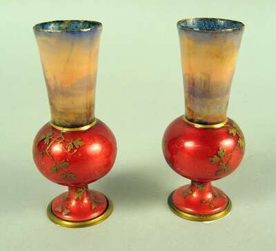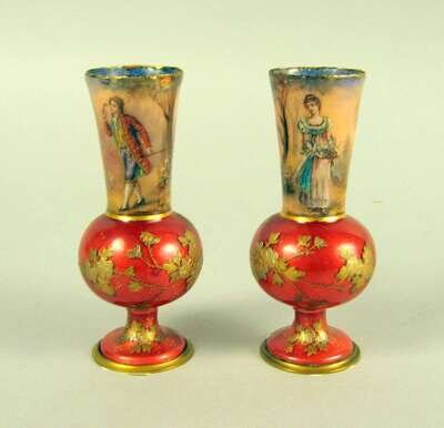 Baluster form, the necks painted with a gentleman and a lady, above a ruby enameled and gilt decorated body. (2).