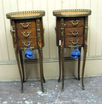 The 3/4 gallery oval top over three drawers with mask mounts to the side, raised on slightly hipped slender cabriole legs ending in sabots. (2).