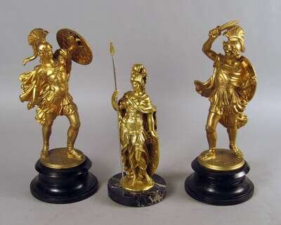 Comprising a figure of Diana on a veined black marble circular base and a pair of gladiators. (3).