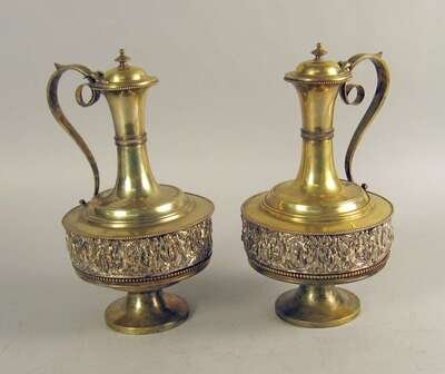 Pair Continental silvered brass Renaissance style ewers late 19th century