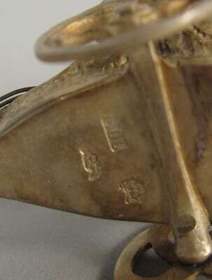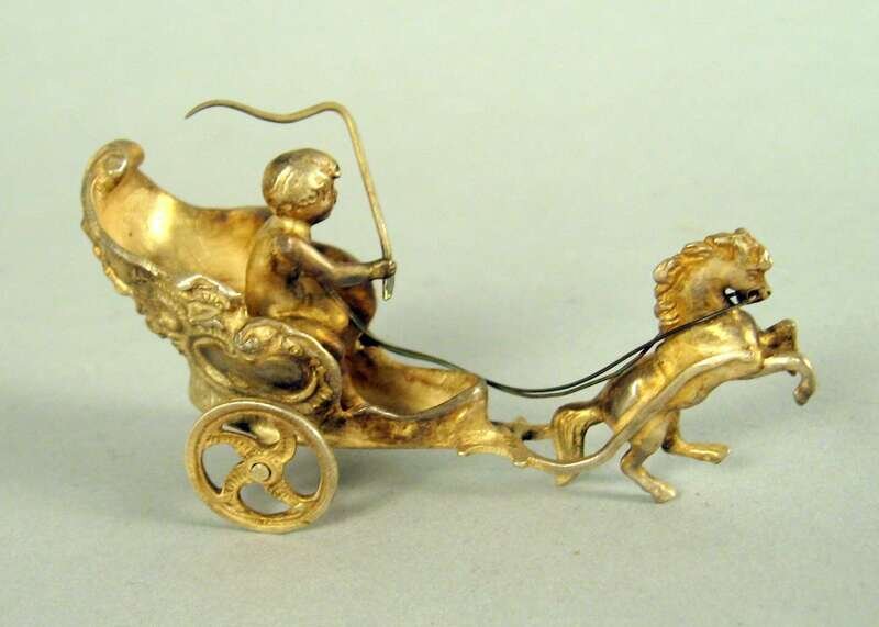 The rococo chariot driven by a putto and pulled by a rearing horse.