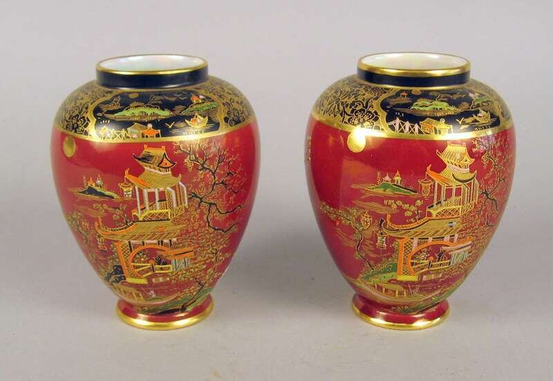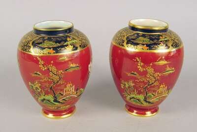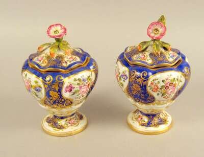 Comprising a pair of Carltonware 'Rouge Royal' pattern covered urns; a Chelsea urn; a Spode covered tureen and underplate; and a pair of Swansea covered urns, each with a foliate painted and blue ground body, marked 'swansea'. (7).