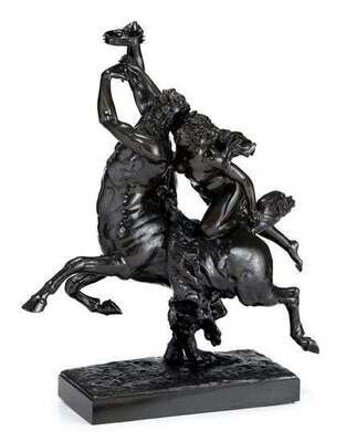 Bronze, dark brown patina, modeled as a centaur and a bacchante on a rectangular base, unsigned.