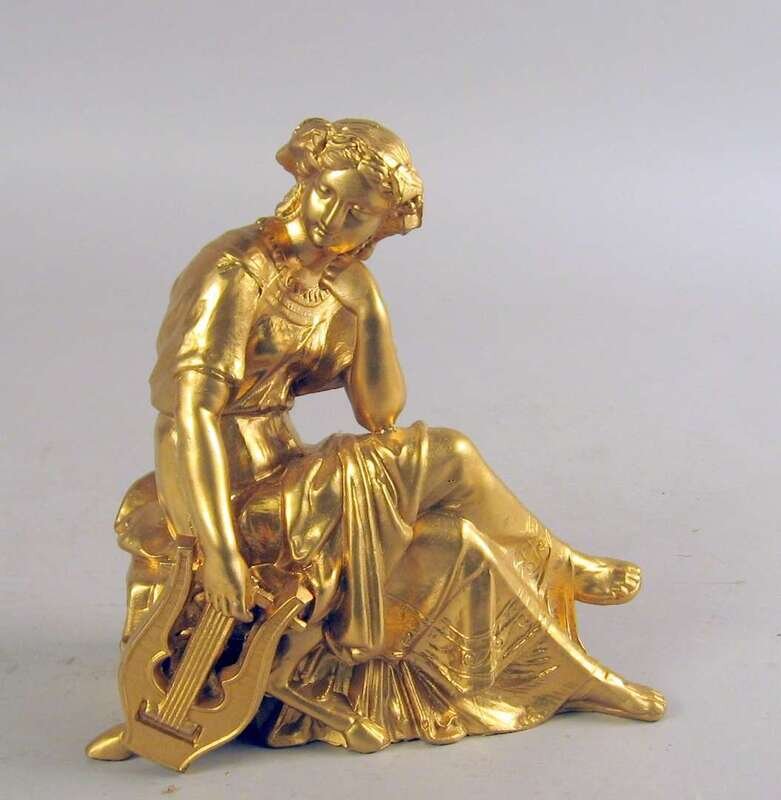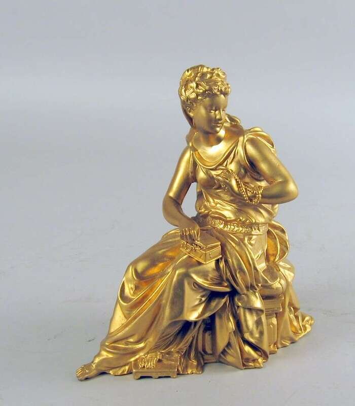 Each modeled seated, one holding a harp and the other a jewel box. (2).