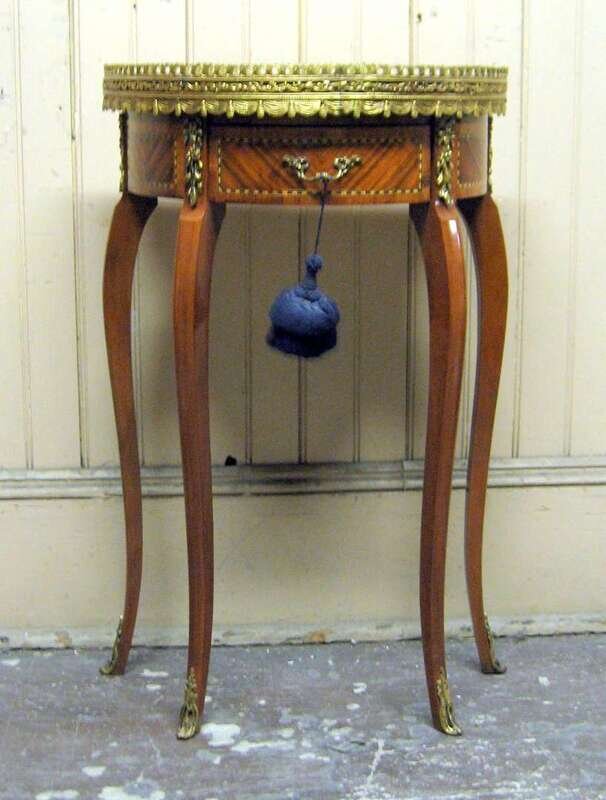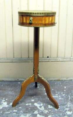 Comprising a marble top demilune table with a pierced gallery and frieze drawer, raised on slender cabriole legs; a floral marquetry drum table with a gallery top over thee drawers, raised on slender cabriole legs; and a kingwood parquetry candlestand with an inset top over a single frieze drawer and candle slide, on an hexagonal support raised on a tripod base. (3).
