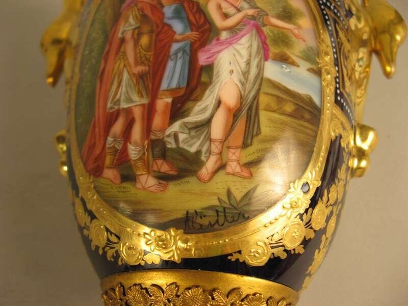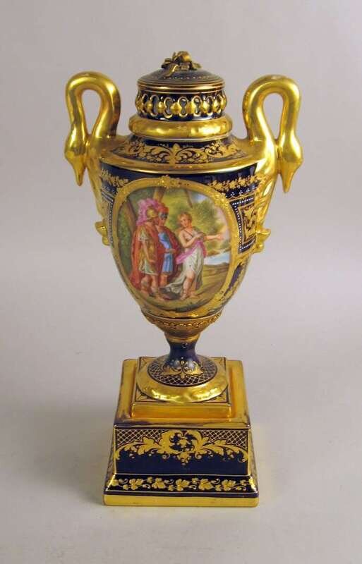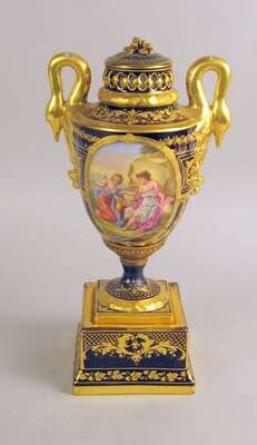 The pierced cover with a ribbon-tied finial over a cobalt body with oval reserves signed Muller, depicting Diana selecting an arrow, the reverse with Achilles and Helen, between swan neck gilt handles, raised on a square base, blue beehive mark.