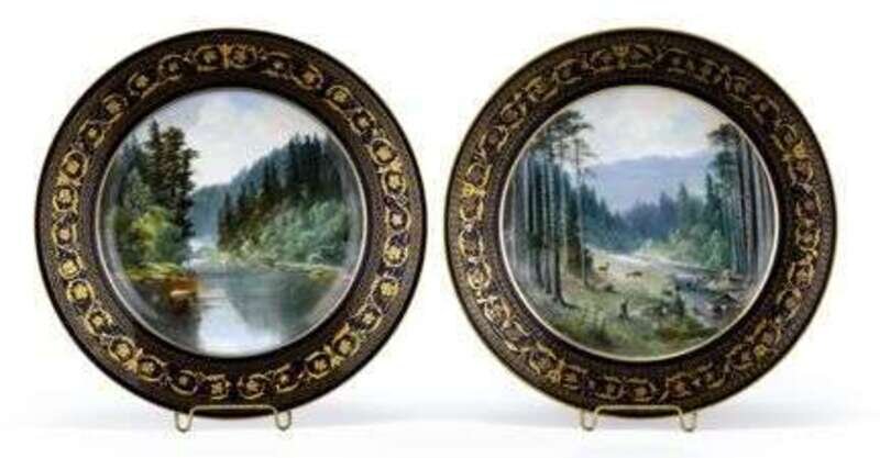 Each painted with landscapes within a raised gilt cobalt blue border, marked on the reverse 'Hermann Voigt/ Karlsbad' and with blue beehive mark. (2).