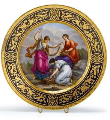 Painted with a scene of three classical maidens arranging floral garlands, within a gilt decorated cobalt border, blue beehive mark to reverse and inscribed 'Flora'.