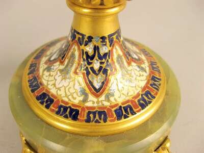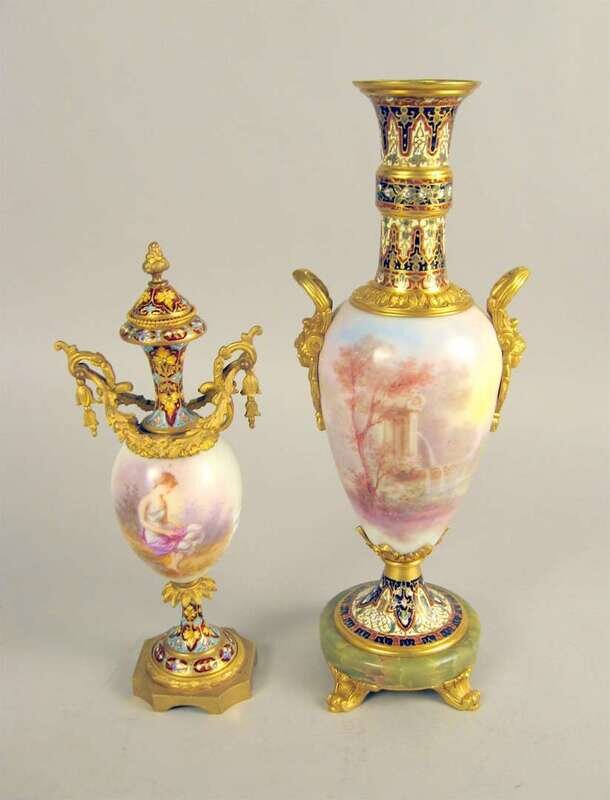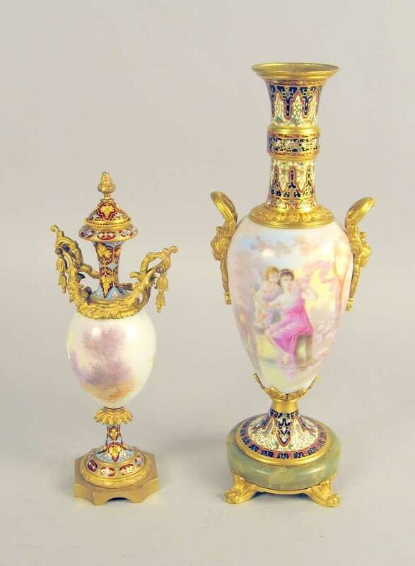 Both baluster form with champleve enamel necks and gilt metal mounts, above bodies painted with scenes of young classical maidens, the larger example raised on an onyx base with scroll feet. (2).